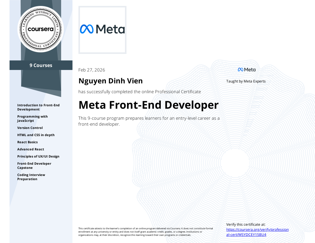 Chứng chỉ phát triển Full Stack từ Meta, bao gồm React, Node.js, và các công nghệ web hiện đại